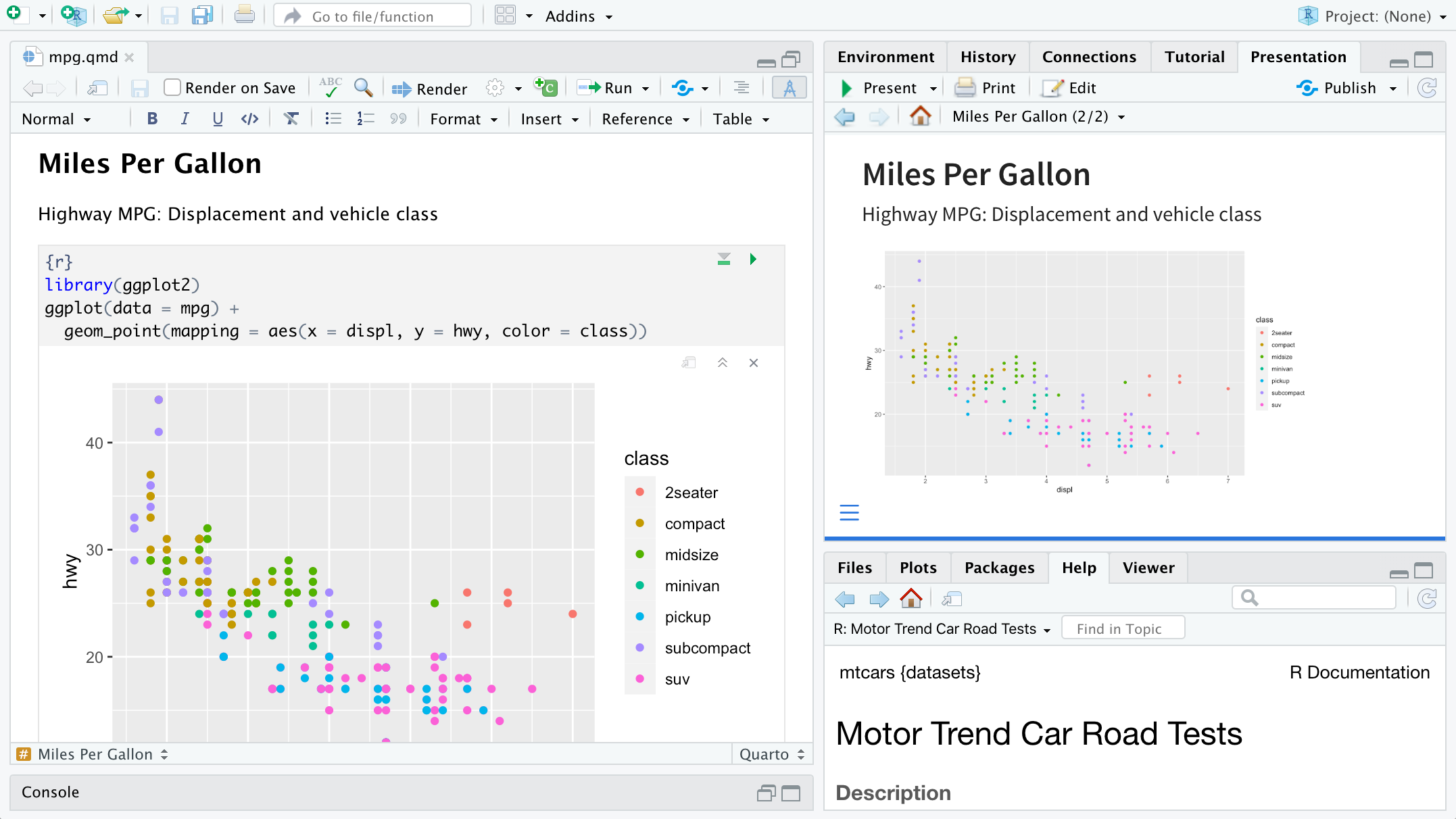 RStudio includes an integrated presentation preview pane