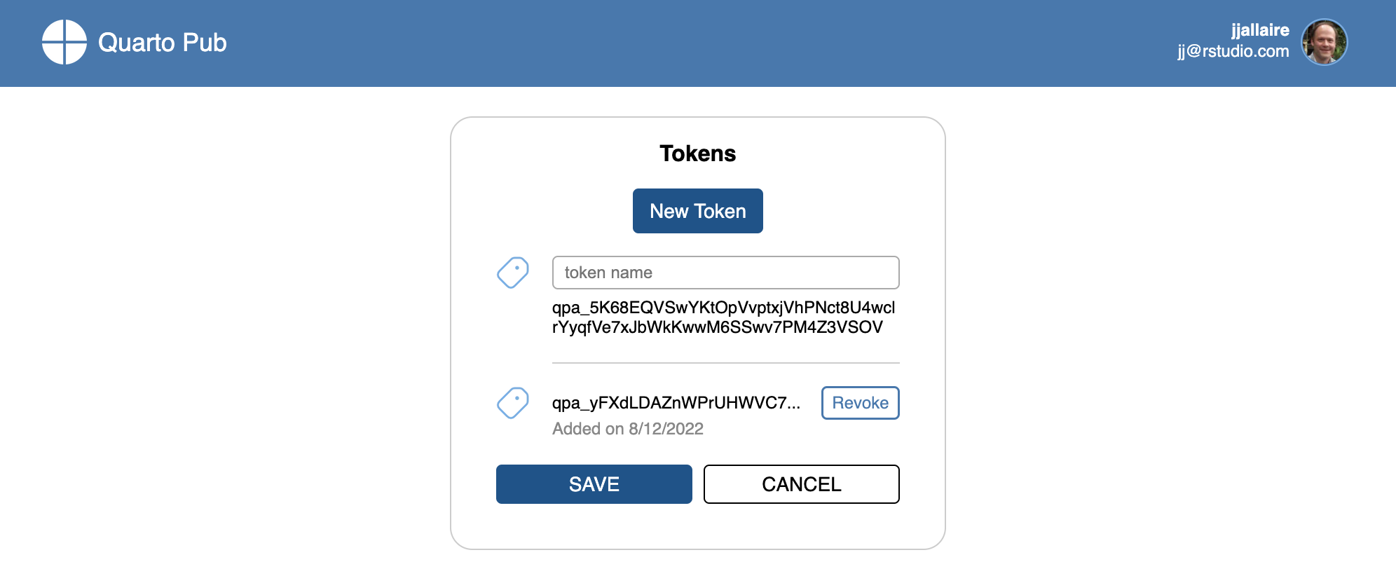 Within this interface you’ll see any token you’ve created from the Quarto CLI. You may revoke this token if you no longer wish it to be active. Click the New Token button to create additional tokens that can be used for publishing non-interactively (e.g. from a CI service):