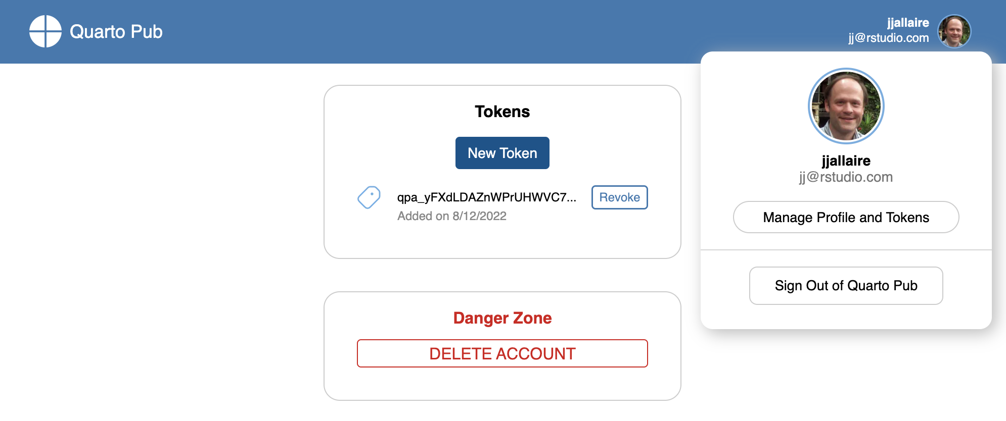 You can also view (and revoke) access tokens from the admin interface at https://quartopub.com: