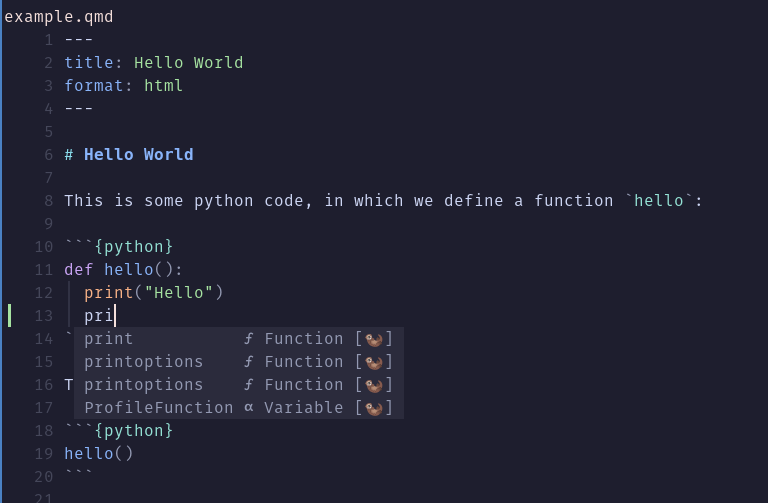 The Quarto Neovim plugin aims to not reinvent the wheel. Existing plugins in the Neovim ecosystem are leveraged to provide the full experience. Some of the features provided by quarto-nvim and enhanced by plugins found in the kickstarter configuration are:
