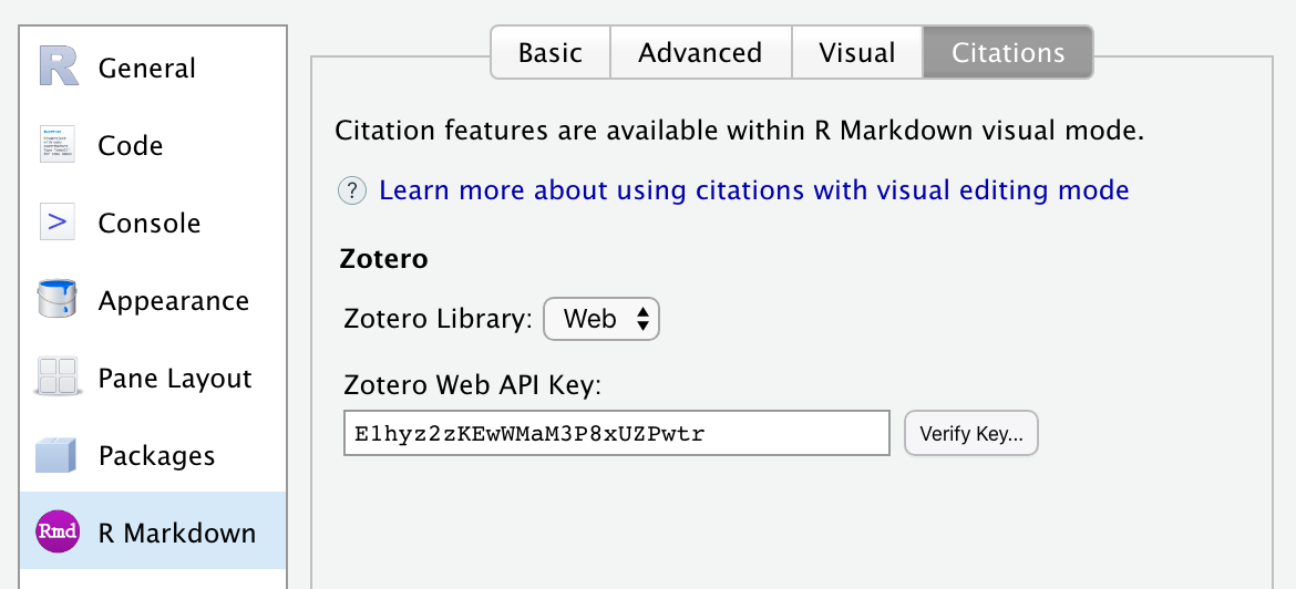 Finally, go to the R Markdown -> Citations preferences to connect Zotero to RStudio using your key: